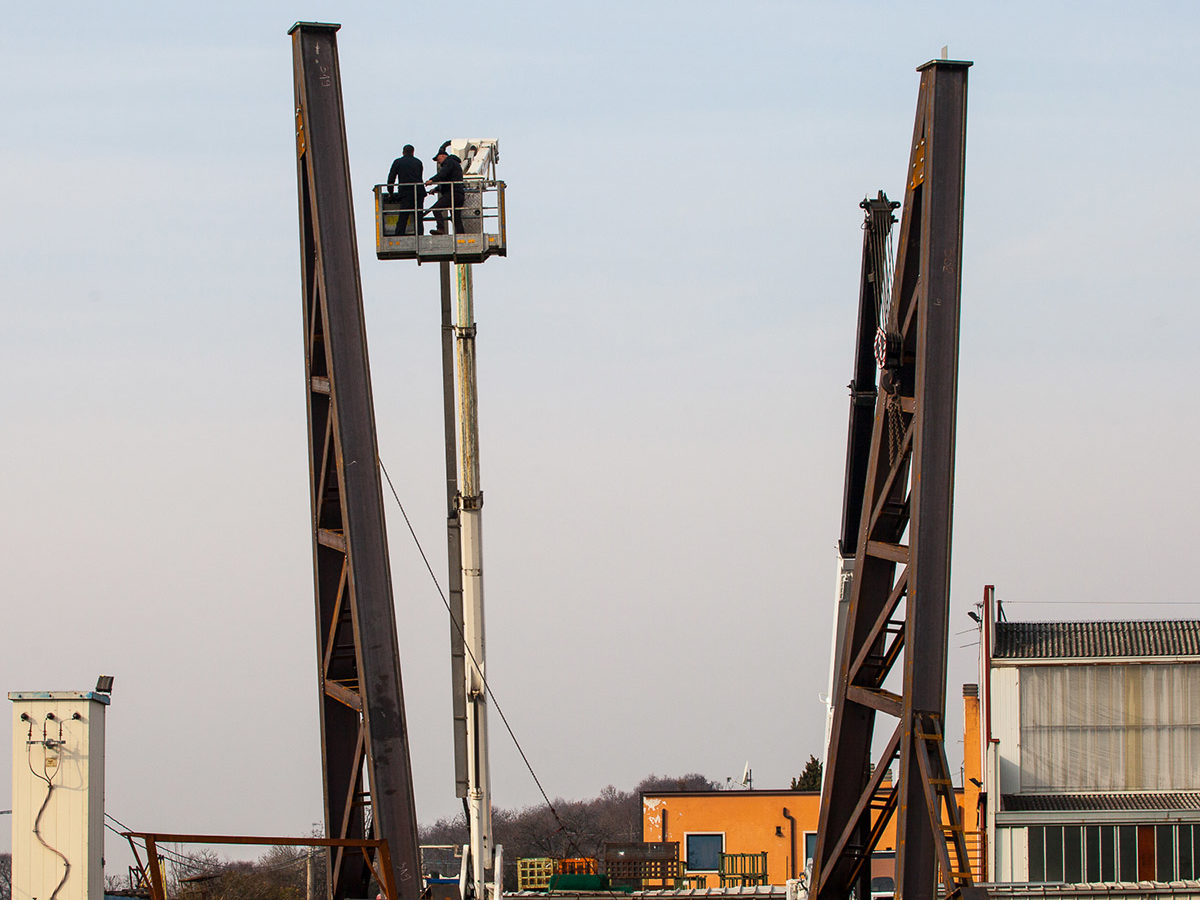 Lorsqu’elle est fermée, la surface extérieure incurvée de la tôle de tablier est chargée contre la pression de l’eau avec les bras radiaux et le système de pivotement associé situés du côté sec.